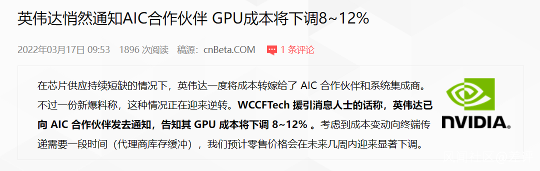 根據國外媒體報道,前陣子英偉達已經通知合作伙伴 GPU 的生產成本將下調 8% - 12%,這意味着芯片已經不是那麼缺貨,顯卡價格還會進一步下降。