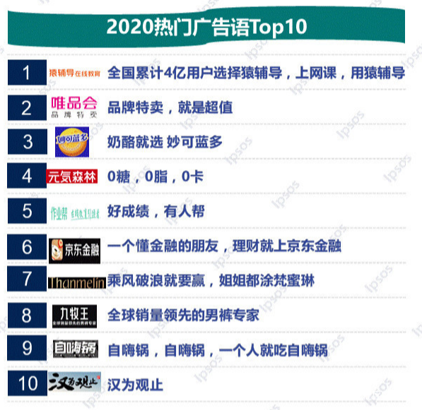 Ipsos 的《 2020 年中國廣告語盤點 》就這麼統計了些熱門廣告語,裏面不少就來自電梯媒體。大夥們也可以看看,自己有沒有被榜上的廣告洗過腦。