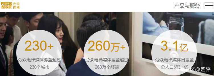 就像他們在官網上説的那樣,全中國 4 億的城市人口中,有 3 億被分眾傳媒的電梯廣告所覆蓋。