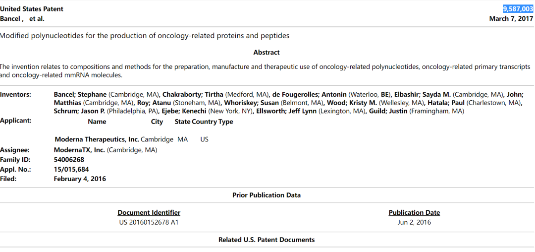 美國醫藥企業莫德納公司專利截圖