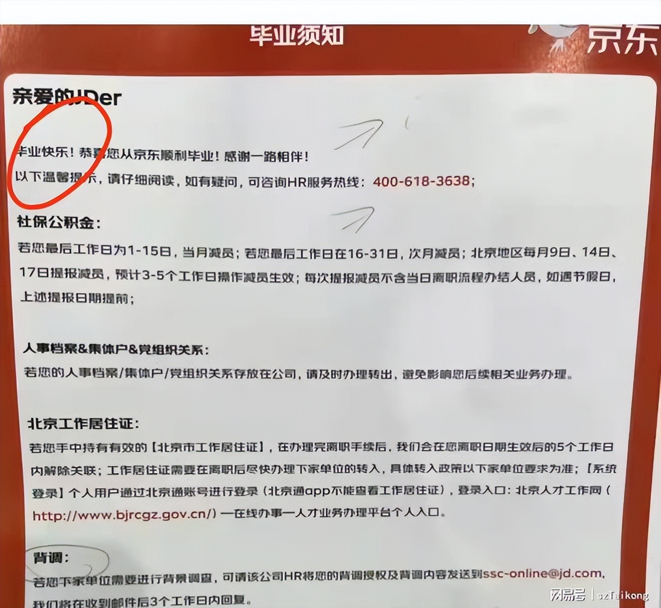 京東又將辭退美名其約稱呼為“畢業”,在給予員工的辭退書上,赫然寫着——“畢業快樂”四個大字。