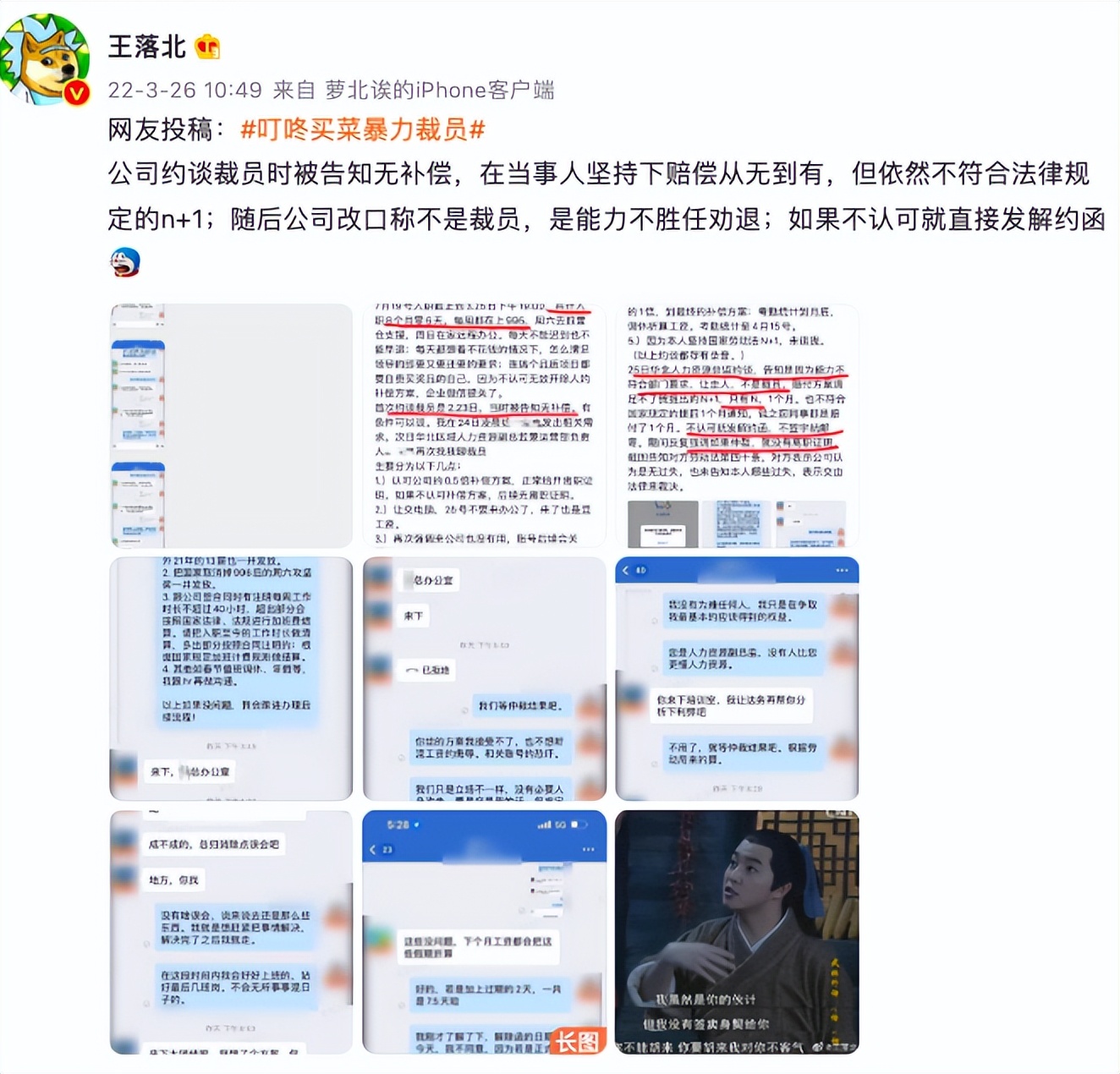 職場博主“王落北”在微博發文,有網友投稿爆料叮咚買菜暴力裁員: