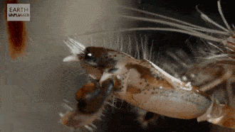 槍蝦則生活在熱帶海洋的淺水區域,得名於它的捕食方式:它們可以通過快速合攏螯足,擠壓噴射出一道時速超過100公里的水流,來打擊獵物。因水流速度極快,在射出時使水氣化,會發出巨大的噼啪聲,像自帶手槍一樣。