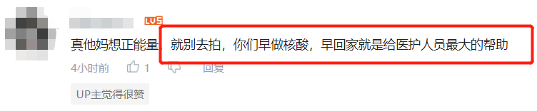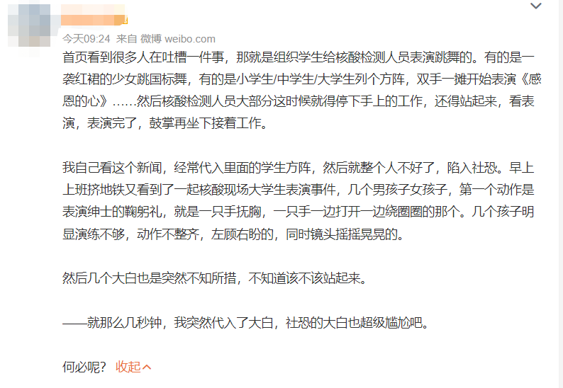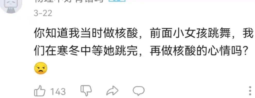 有人説醫務人員等着下班呢,別搞這些虛頭巴腦的東西,早點讓他們做完核酸回家就是最大的感謝。