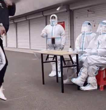 直接就站在核酸檢測的桌子前,開始跳舞。
