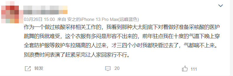 本來現在核酸檢測人手就不夠,工作時間長,還要在這時候搞這麼些表演節目,不但耽誤後面人排隊做核酸,也無形延長了這些醫務人員的工作時長。