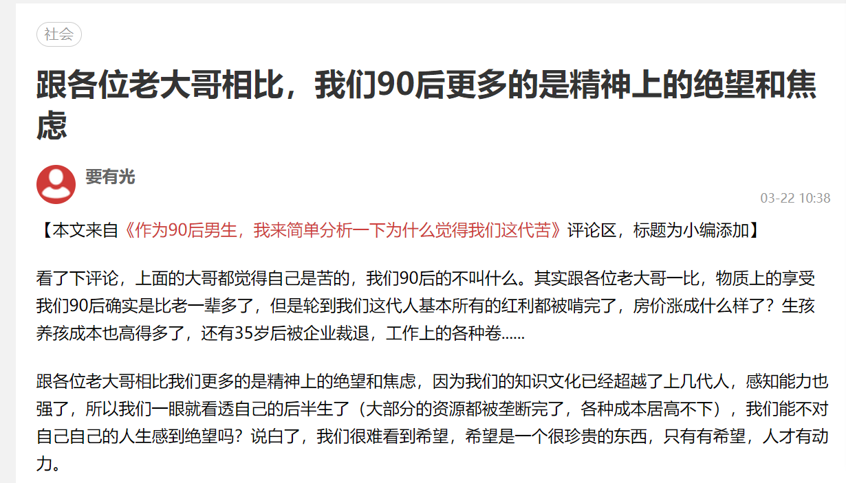 比如這個小哥説的,確實如今90後吃穿不愁,不許上一輩還捱過餓,但是關鍵是精神上的絕望啊,當年大家都窮都差不多,所以不覺得怎麼樣。