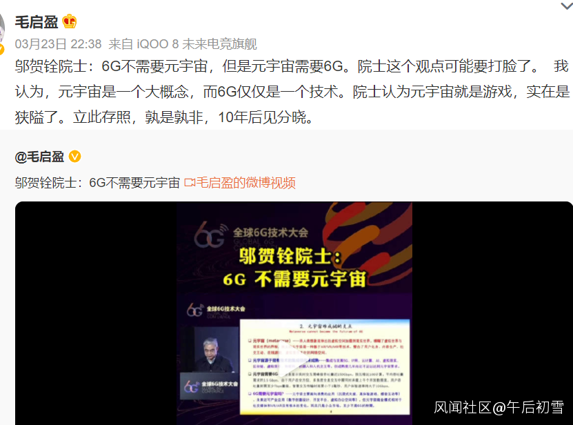 對於鄔賀銓院士“6G不需要元宇宙,但是元宇宙需要6G”這個觀點,資深媒體人毛啓盈發微博指出,“院士這個觀點可能要打臉了。我認為,元宇宙是一個大概念,而6G僅僅是一個技術。院士認為元宇宙就是遊戲,實在是狹隘了。立此存照,孰是孰非,10年後見分曉。”