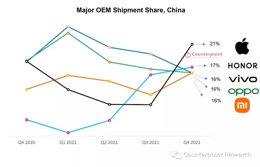 自榮耀50系列發佈起,榮耀絕地反擊,從低谷期一路爬升,終於在2021年末,又重新奪回了市場領先的位置——根據Counterpoint數據顯示,2021年第四季度,榮耀中國市場出貨量排名升至第二,位列安卓陣營第一,僅次於蘋果,在國產手機品牌排名第一。