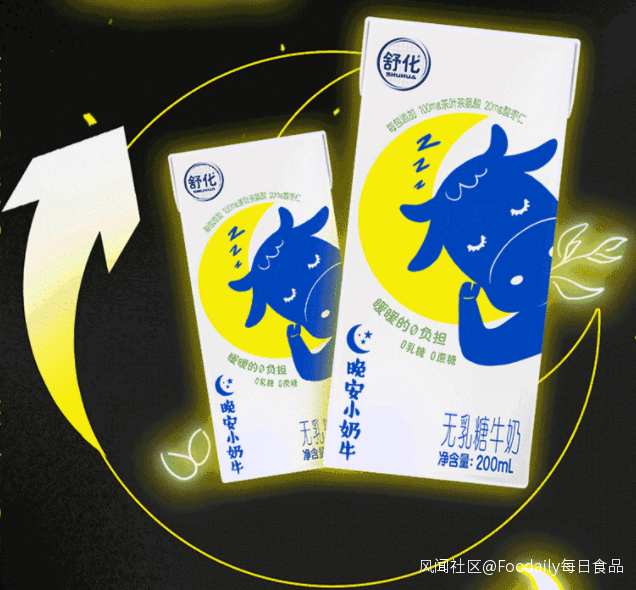 3月21日,正值世界睡眠日,伊利旗下舒化宣佈推出睡前牛奶晚安小奶牛,聚焦睡眠障礙人羣。新品在無乳糖牛奶的基礎上添加了茶氨酸、酸棗仁兩大助眠成分,每盒含茶氨酸100mg、酸棗仁20mg,自然成分温和助眠。此外,新品0蔗糖添加,不給睡前身體帶來額外負擔,200mL的小規格也更適合睡前飲用。