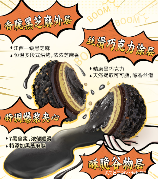 近日,老金磨方上新一款爆漿黑芝麻丸,採用4層結構:黑芝麻外層選用江西一級黑芝麻,含鈣、蛋白質、鐵等多種營養,恆温多段式烘烤芝麻濃香脆爽;巧克力塗層選用精磨黑巧克力,天然可可脂絲滑醇香;穀物層嚴選優質穀物,動態控温烤制酥脆十足;爆漿夾心含有黑桑葚、黑豆、黑米等7種黑色食材,還特別添加黑芝麻肽,“丸”爆黑科技養髮。新品天貓旗艦店售價17g*2盒/26.9元。