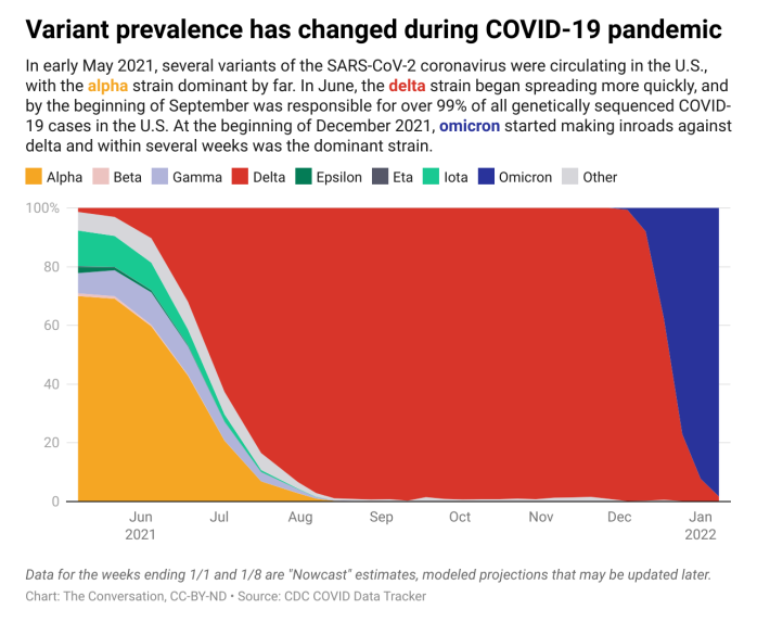 從微觀層面來看,新冠病毒基因組在每次複製時的突變概率是一定的;但是,新冠病毒基因組在宏觀的感染羣體中發生突變的概率,是微觀的個體概率的總和。也就是説,感染羣體的基數越大,病毒出現新突變株的概率就越大。由於世界上多數國家在防疫方面徹底“躺平”,疫情失控造就了極為龐大的感染羣體。根據美國約翰.霍普金斯大學的統計數據,截至2022年3月27日,全球累計已有4.8億人感染新冠肺炎。儘管新冠肺炎基因組的突變率在RNA病毒中算是居中水平,但乘以如此龐大的感染羣體基數,突變株必然隔三岔五蹦出來。更何況,傳染性更強的突變株會在傳播中迅速壓倒更早的毒株。從美國的數據來看,奧密克戎突變株取代德爾塔及更早的毒株,只用了短短1個來月的時間。