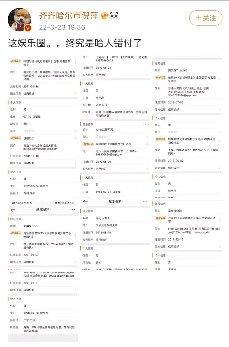 博主@齊齊哈爾市倪萍 截出部分嘻哈歌手的微博並寫道,“這娛樂圈……終究是哈人錯付了。”從截圖中可以看到,高天佐、Tangoz等人的微博均可查到IP地址。下方有熱心觀眾補充道:於貞是女明星,她查不到IP地址。