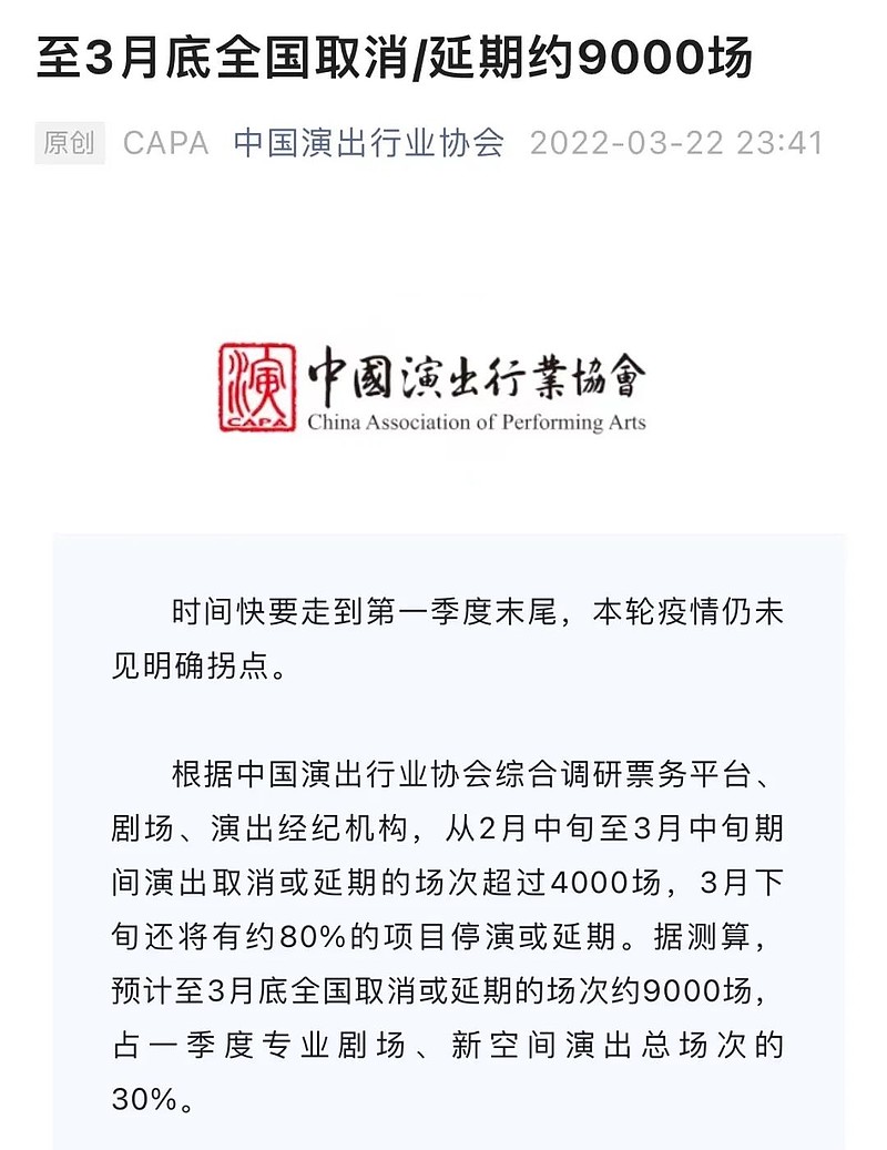 據中國演出行業協會發布,預計至3月底全國取消或延期的場次約9000場,佔一季度專業劇場、新空間演出總場次的30%。預計一季度演出場次較2021年同期降低25%以上,票房收入降低35%以上。
