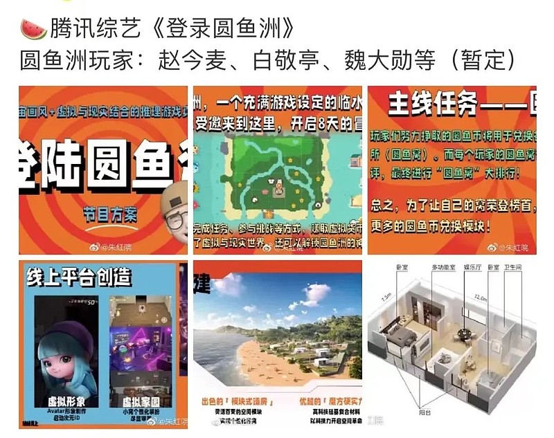 上週,恰好也有網友爆料了一檔新綜藝《登錄圓魚洲》,消息並未確定是否屬實,但不妨礙網民的熱烈討論。爆料者宣稱,這檔節目將“如樂高遊戲般搭建現實世界中的圓魚洲,邀請6位明星前來,努力掙取圓魚幣,以建造圓魚窩並進行排名”。
