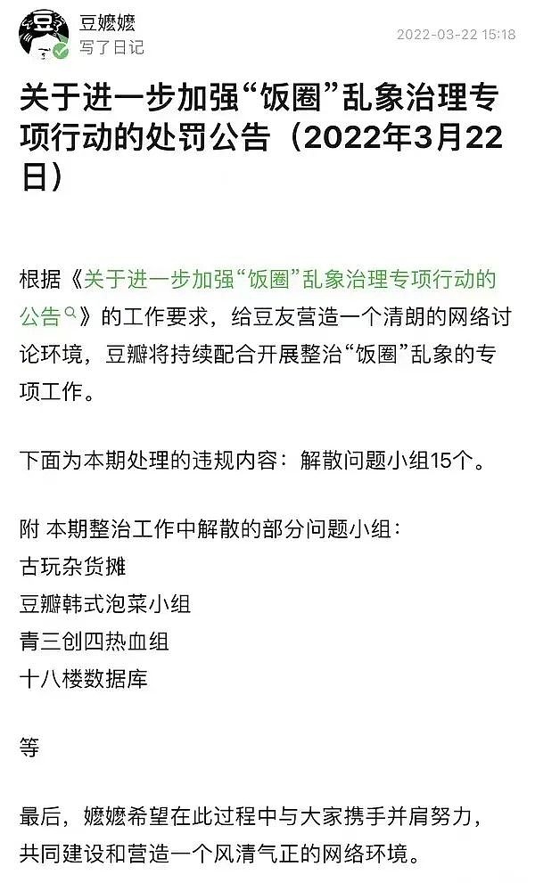 豆瓣官方賬號“豆嬤嬤”發佈公告,宣佈解散15個問題小組,包括古玩雜貨攤、豆瓣韓式泡菜小組、青三創四熱血組、十八樓數據庫等等。據報道,2021年1月至11月,國家互聯網信息辦公室指導北京市互聯網信息辦公室,對豆瓣網實施20次處置處罰,多次予以頂格50萬元罰款,共累計罰款900萬元。
