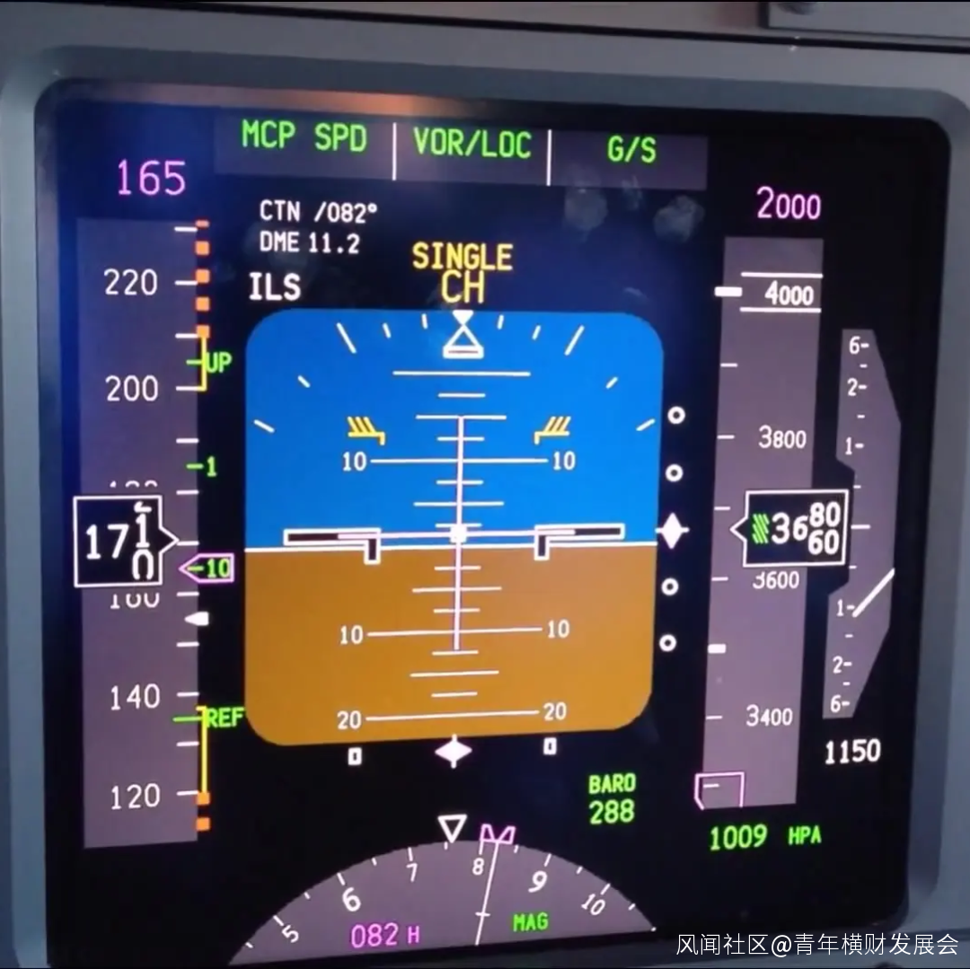 △波音737電子儀表左側顯示速度,右側顯示高度