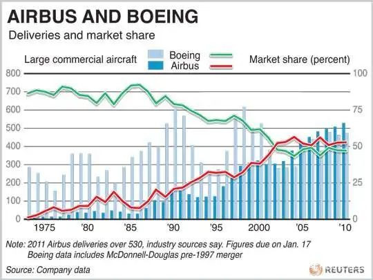 與此同時,空客在躲過「麥道奪舍」後,不斷蠶食波音的市場份額,並在2003年實現了反超。