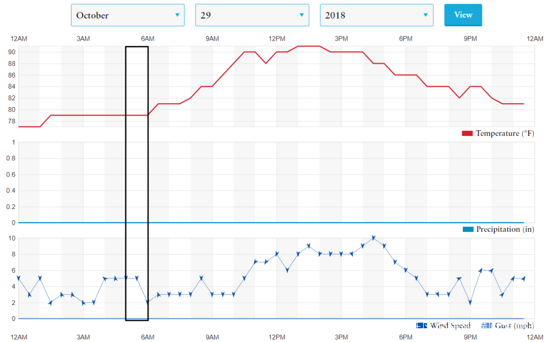△2018年10月29日雅加達機場氣象資料,黑框部分為飛機起飛時的天氣狀況。從上至下依次為温度、降水量以及地面風力