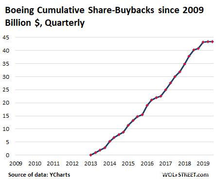 △波音股票回購累計圖:用於股票回購1/4的錢都夠造新系列機型了