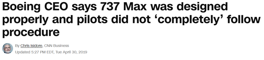 但波音CEO米倫伯格仍然聲稱:“安全是波音的頭等大事,我們仍對MAX機型充滿信心。”並且仍然試圖甩鍋到飛行員身上:“MCAS可能確實再次被錯誤啓動,但埃航的飛行員沒有完全按照他們應該做的去做。”