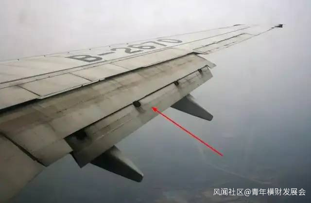 △箭頭所指即為襟翼,起飛時能增強升力,降落時能增加阻力以便減速。當超過一定速度時,襟翼必須完全收回,否則有被扯斷的風險。