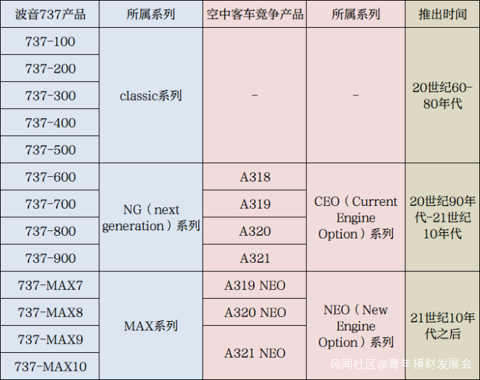 △波音737系列產品及競爭對手空客A320系列產品對比表。可以看出,在空客公司進入市場之後,波音感到了明顯的壓力