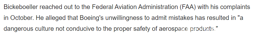吹哨人也在去年底向美國聯邦航空管理局(下文簡稱FAA)就此事提出了投訴,認為波音不願承****認錯誤的姿態將培育一種不利於航空器安全發展的危險文化。