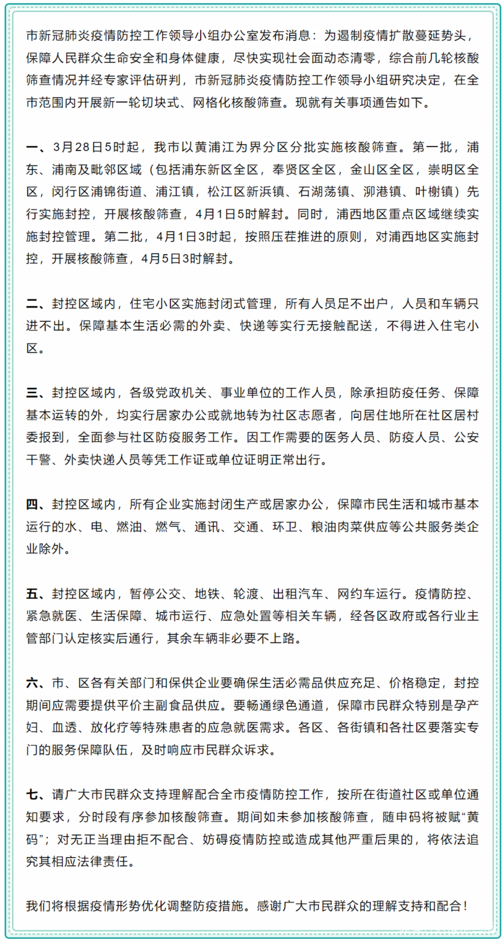 一、3月28日5時起,上海市以黃浦江為界分區分批實施核酸篩查。第一批,浦東、浦南及毗鄰區域(包括浦東新區全區,奉賢區全區,金山區全區,崇明區全區,閔行區浦錦街道、浦江鎮,松江區新浜鎮、石湖蕩鎮、泖港鎮、葉榭鎮)先行實施封控,開展核酸篩查,4月1日5時解封。同時,浦西地區重點區域繼續實施封控管理。第二批,4月1日3時起,按照壓茬推進的原則,對浦西地區實施封控,開展核酸篩查,4月5日3時解封。