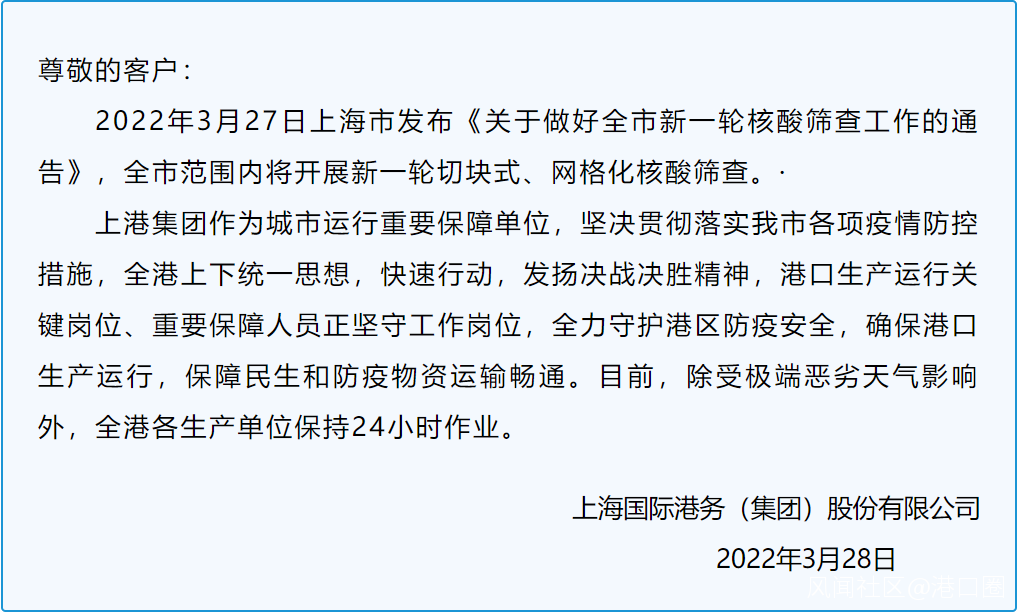 上海港外高橋港區以及連接洋山港區的東海大橋均在浦東新區,已自3月28日5時起實施封控,封控區域內,住宅小區實施封閉式管理,所有企業實施封閉生產或居家辦公,但保障市民生活和城市基本運行的公共服務類企業除外。上港集團作為公共服務類企業,已經發佈告客户書,表示全港各生產單位將保持24小時作業: