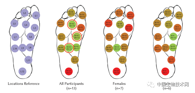 有13名參與者(7名女性和6名男性)測試了被TickleFoot搔癢的感覺,並使用李克特7點量表對腳底不同區域感受到癢的程度進行評分。