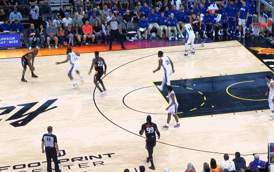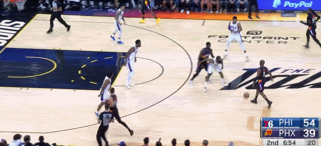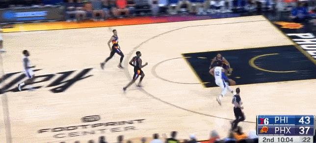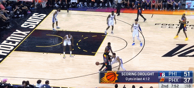 但是在保羅下去之後不到2分鐘,太陽就被費城打了一波8-0,其中兩次是因為進攻沒有組織好,被費城投進反擊三分。