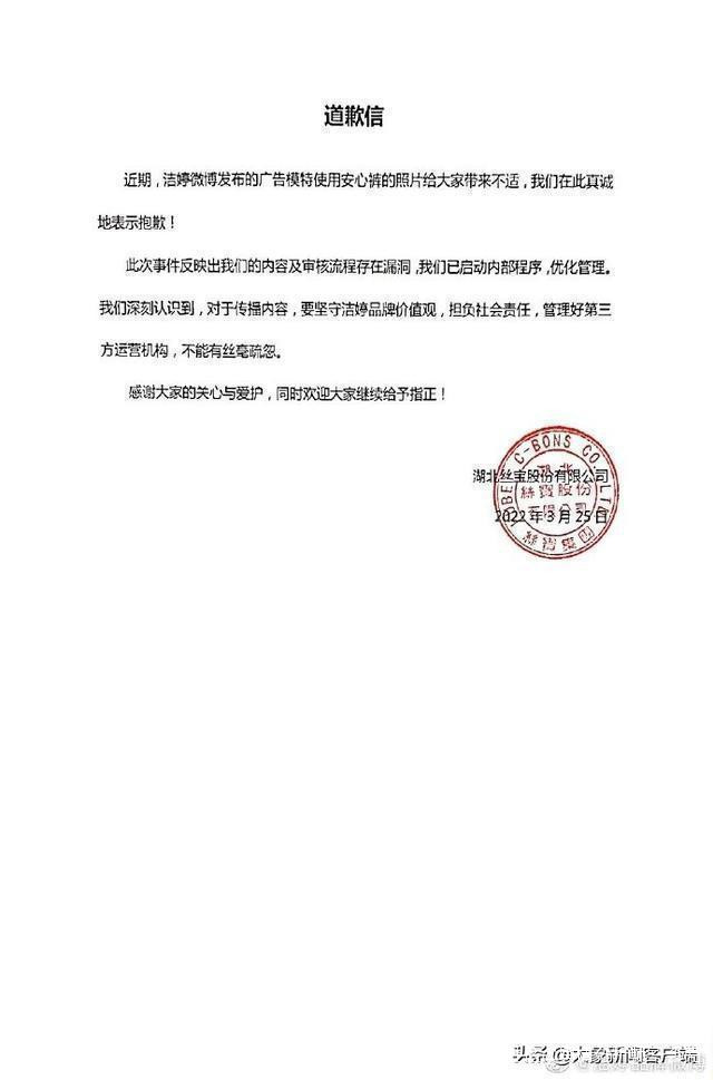 3月25日,潔婷品牌微博發佈道歉聲明:近期,潔婷微博發佈的廣告模特使用安心褲的照片給大家帶來不適,我們在此真誠地表示抱歉!此次事件反映出我們的內容及審核流程存在漏洞,我們已啓動內部程序,優化管理。我們深刻認識到,對於傳播內容,要堅守潔婷品牌價值觀,擔負社會責任,管理好第三方運營機構,不能有絲毫疏忽。