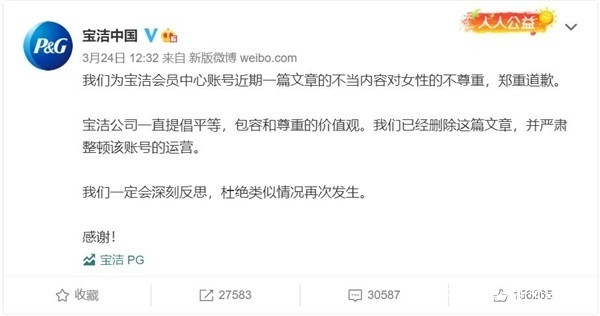 寶潔中國3月24日在微博聲明稱,為寶潔會員中心賬號近期一篇文章的不當內容對女性的不尊重,鄭重道歉。寶潔公司一直提倡平等,包容和尊重的價值觀。我們已經刪除這篇文章,並嚴肅整頓該賬號的運營。對於很多進入廣告行業的人來説,都希望自己公司的文案策劃設計可以火爆全網,但是相信沒有一家公司希望自己的設計文案成為不可挽回的污點,對於企業本身造成的輿情難以平息。
