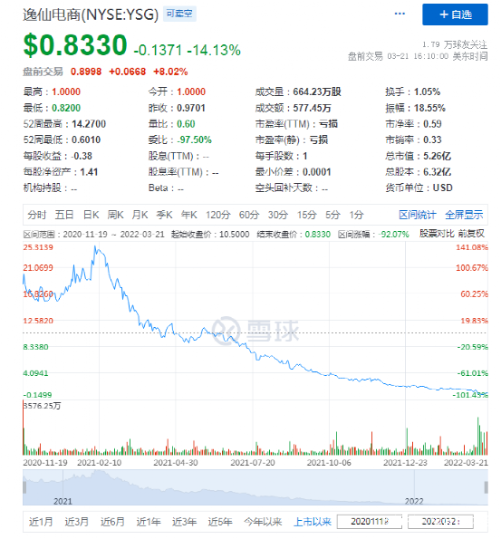 完美日記母公司逸仙電商也是股價大幅下跌的中概股之一,自2020年11月上市後,3月21日收盤價相較於發行價已經跌去92.07%,最低價相較於最高價跌去97%左右。