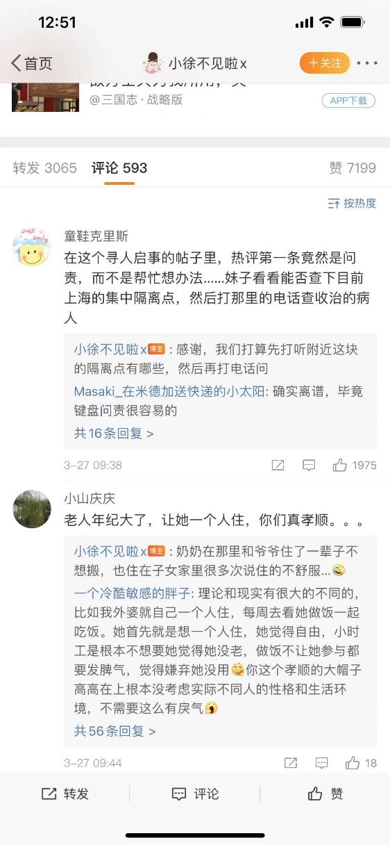 但終於有人發現不對了:怎麼肥事兒?貼子裏熱評排第一的,居然是對家人問責,卻不關心如何找到失蹤的奶奶?