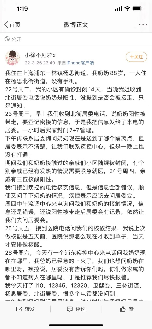 26日——此時奶奶已被大白帶走三天——浦東疾控中心打來電話,詢問:“你奶奶到底在哪裏?”