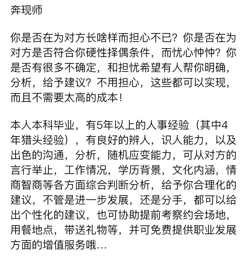 比如從文化底藴、家庭背景、工作情況、人際社交、情商智商等方面考察,這些商家還可以根據這些因素給你出一份分析報告……