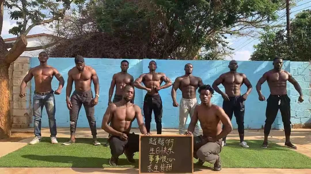 只見一羣皮膚黝黑、肌肉壯碩的黑人僱傭兵排好隊形,面前架着祝福語牌子,顯得氣勢十足。
