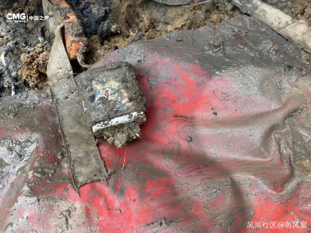 一位工作人員在淤泥裏找到幾件紅色的航空救生衣,是扁平的、沒有充氣。旁邊還有一個白色的小塑料盒,擦掉淤泥,露出哆啦A夢的圖案(中央廣播電視總枱記者 白傑戈 攝)