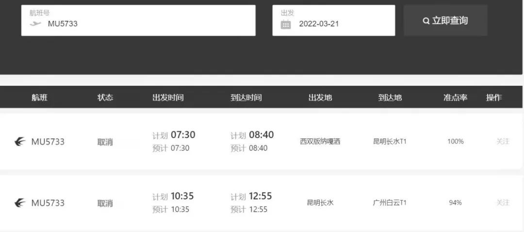 3月21日早上,MU5733航班取消