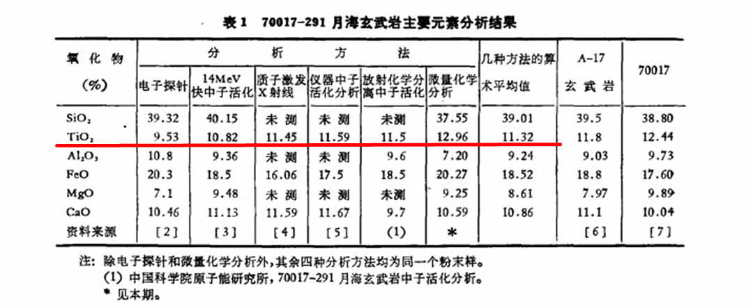 根據1981年發表在《地球化學》期刊上的論文《阿波羅-17(70017—291)高鈦月海玄武岩的化學組成及其成因的探討》,我們可以知道中國科學家對美國送來的1克月岩樣本中的一半進行了6種方法的化學成分分析,確定其中TiO2的算術平均值為11.32%。