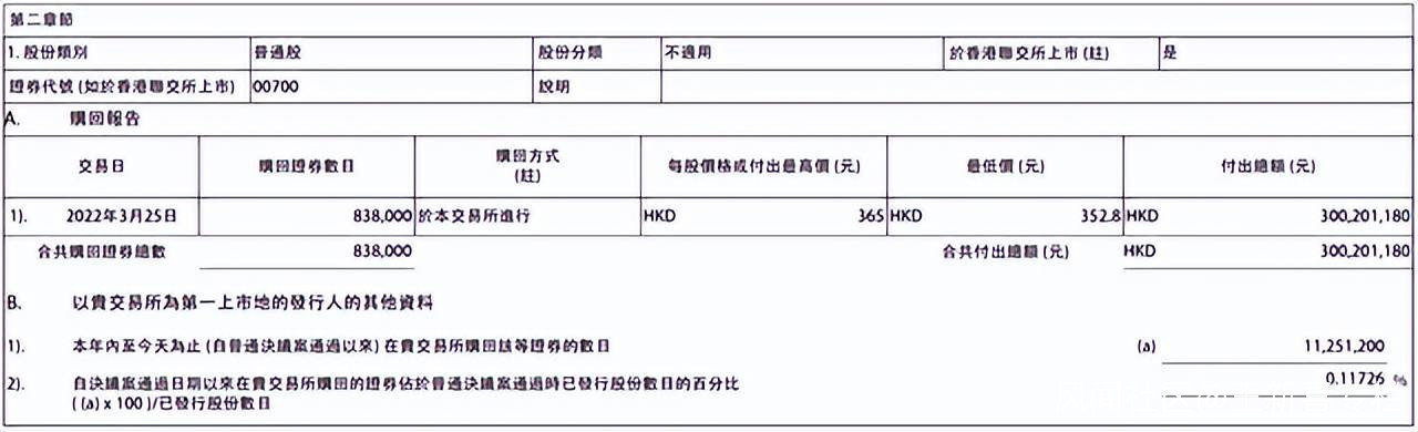 在阿里回購250億美金創下中概股回購紀錄之後,騰訊與小米跟上,3月25日晚間,騰訊發佈公告稱,公司3月25日以每股352.8港元至365港元的價格回購83.8萬股,耗資約3億港元。