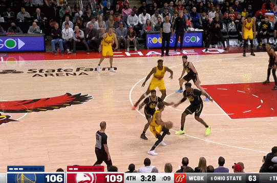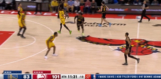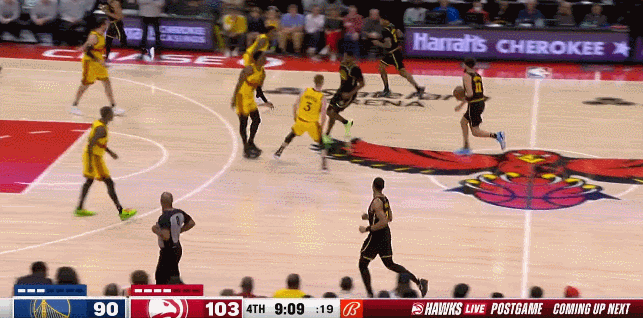 從第四節初克萊帶隊追分那段可以看得很清楚:11分37秒,赫爾特超遠三分不中,勇士拿到籃板,普爾持球過半場,老鷹沒對好人,普爾助攻克萊三分;
