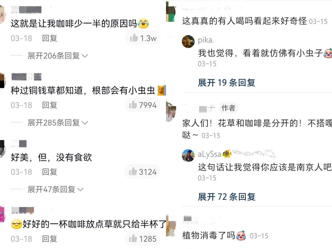 不少網友對於“西湖咖啡”原材料的使用提出食安的質疑:“銅錢草根部會有小蟲蟲”、“這銅錢草衞生嗎”。