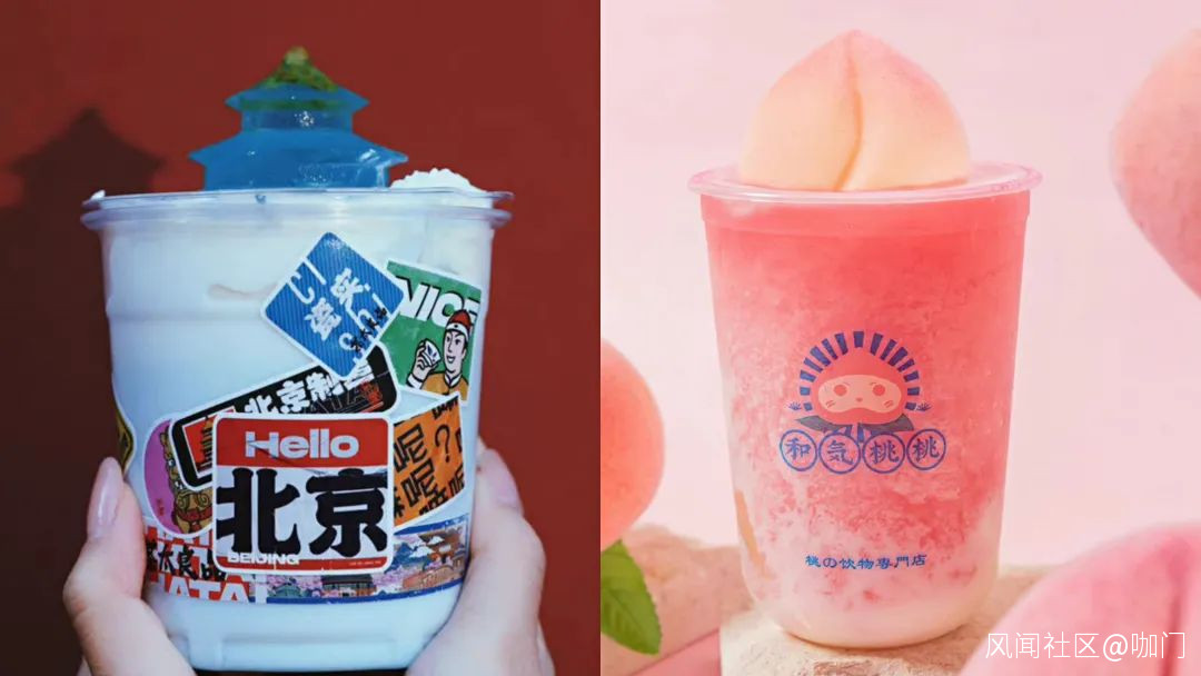 常見的頂部造景,茶飲品牌用得頗多,去年10月,茶太良品把“天壇放到奶茶上”,用融入藍柑和綠檸汁的茶凍做成“福塔”的造型,和氣桃桃利用水果(整顆桃子)做造景。
