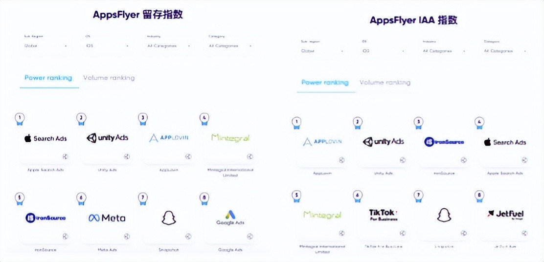 目前來看,數字廣告市場競爭格局正出現變化,根據AppsFlyer《廣告平台綜合表現報告》,在移動廣告平台留存指數榜單、IAA指數榜單中,Applovin、unityAds以及匯量科技旗下Mintegral等第三方廣告平台排名高於Meta、Google。