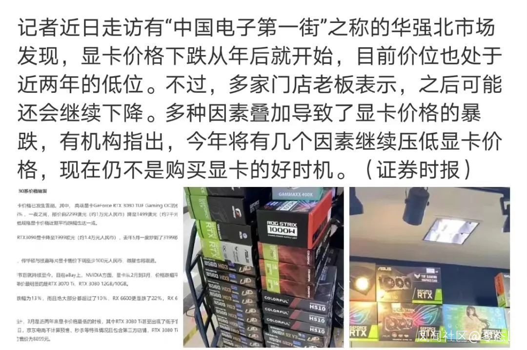 “降價明顯,店家稱還會繼續降。”近日,有媒體走訪有“中國電子第一街”之稱的華強北市場,發現顯卡價格從年後就開始下跌。3月25日,#顯卡報價雪崩#的話題也頻頻登上熱搜。