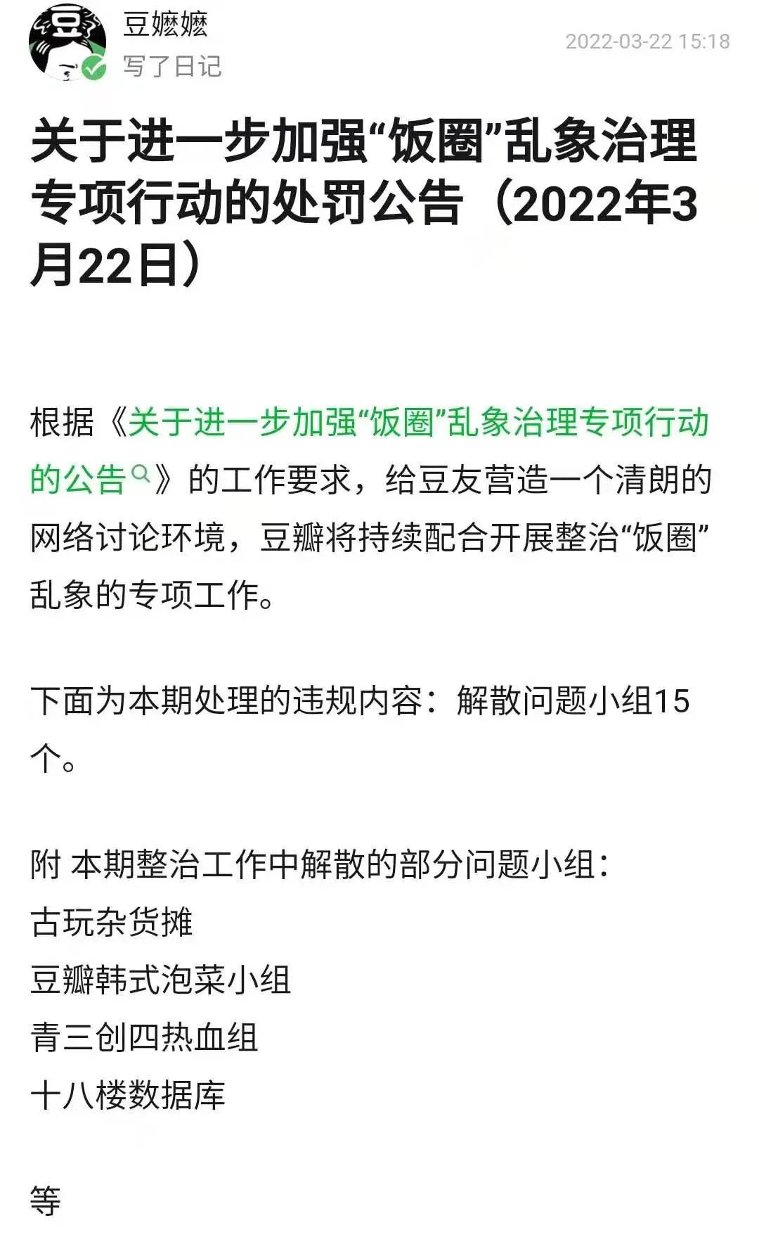 3月22日,豆瓣官方賬號@豆嬤嬤發佈《關於進一步加強“飯圈”亂象治理專項行動的處罰公告》,公告顯示,解散古玩雜貨攤、豆瓣韓式泡菜小組、青三創四熱血組、十八樓數據庫等15個問題小組。由豆瓣公佈的4個小組不難猜測,本次處罰的主要打擊對象仍舊是“飯圈”。