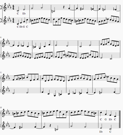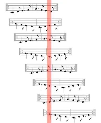 它用了一個很短的旋律,然後將其倒影(上下翻轉),再複製四次,這樣就得到了八條旋律。然後下一條旋律都比前一條慢一拍進入,於是得到了一首曲子。